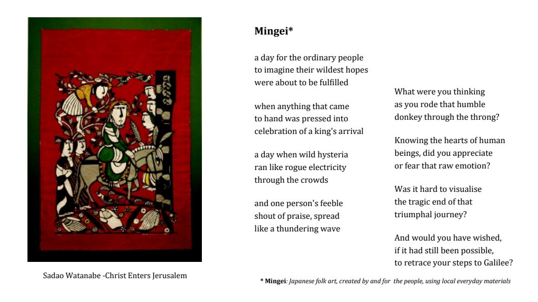In our Mingei picture, a man looks down on the spectacle from the top of a tree, raising the question as to whether this could be the Zacchaeus who plays a star part in a completely different story. However, in that story, we are led to believe that Zacchaeus was changed by his encounter with Jesus and no longer had any reason to climb into a tree to see him.